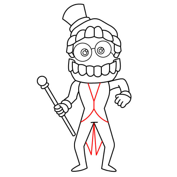 Lisää Cainen vartaloon viimeiset yksityiskohdat hänen muodollisen asunsa aikaansaamiseksi. Piirrä rintakaulukset ja viivat vartaloon luodaksesi liivin ja takin muodon. Käytä suoria, kulmikkaita viivoja luodaksesi illuusion jaetusta hännästä takin takaosaan.