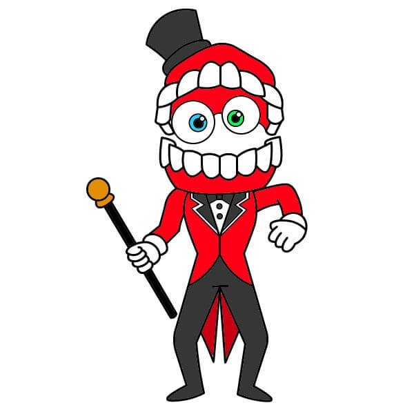 Caine väritetään aloittamalla hänen silmiinpistävistä piirteistään: väritä hänen ikenensä/päänsä kirkkaan punaisiksi, mutta pidä hampaat kirkkaan valkoisina. Hänen silmänsä eivät ole symmetriset, joten väritä toisen silmän tausta kirkkaan siniseksi ja toisen vihreäksi, silmälasit yleensä tummanharmaiksi tai mustiksi. Hänen juhla-asussaan väritä silinterihattu, housut ja kepin runko mustaksi. Hänen pukunsa on kontrastinpunainen, kun taas liivi (V-muotoinen) ja hansikkaat kädet ovat valkoiset. Lopuksi väritä hänen kepin kärjessä oleva pallo kultaiseksi tai kirkkaan keltaiseksi.