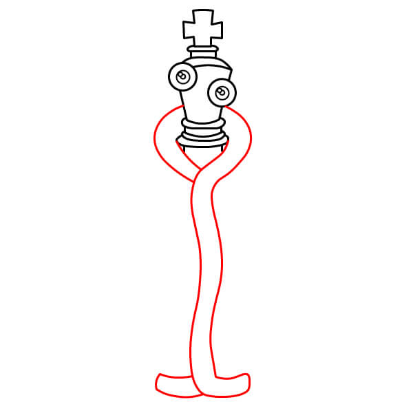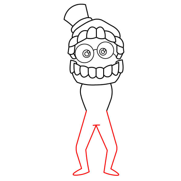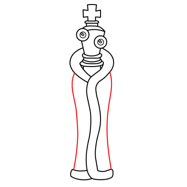 Piirrä oikea jalka (katsojan vasemmalle puolelle). Tämä jalka on yksinkertaisempi: suora, ohut jalka, joka ulottuu alaspäin ja päättyy suureen, sarjakuvamaiseen saappaaseen, jossa on hihansuun.