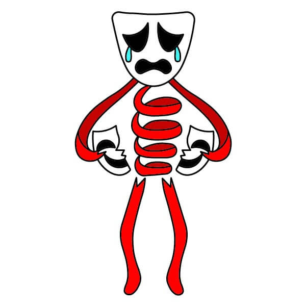 Väritä kaikki nauhan osat – spiraalimainen vartalo, kädet ja jalat – kirkkaan punaisiksi. Pidä päänaamio päässä ja rikkinäiset naamionpalat käsissä valkoisina. Väritä naamioiden silmien ja suun ääriviivat mustiksi. Väritä naamion pisara vaaleansinisiksi.