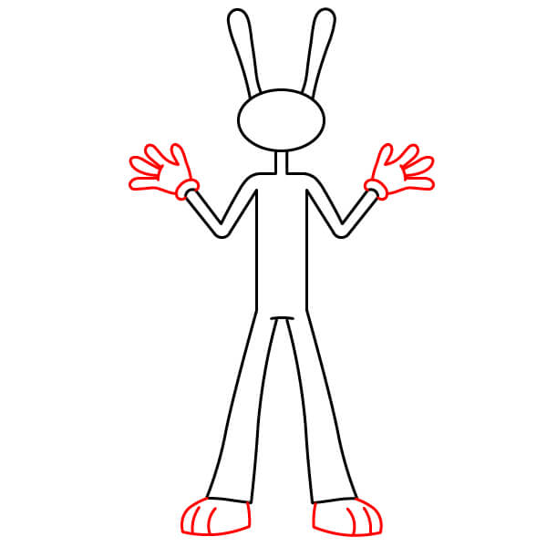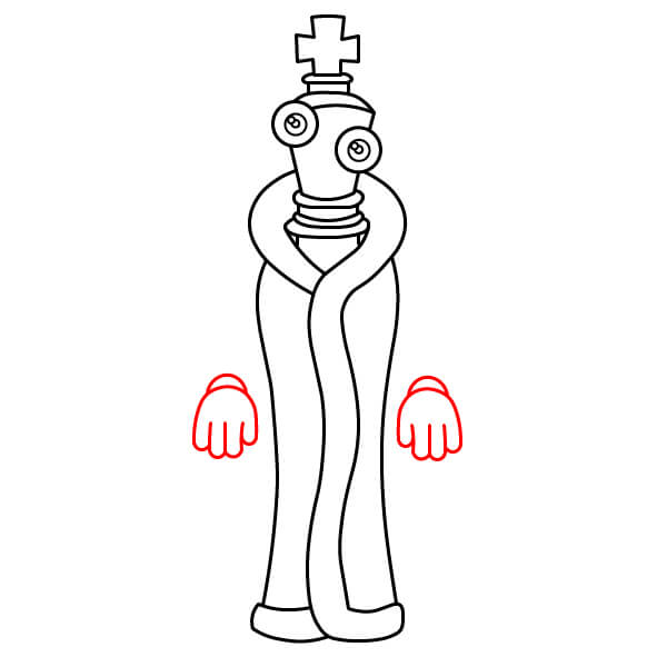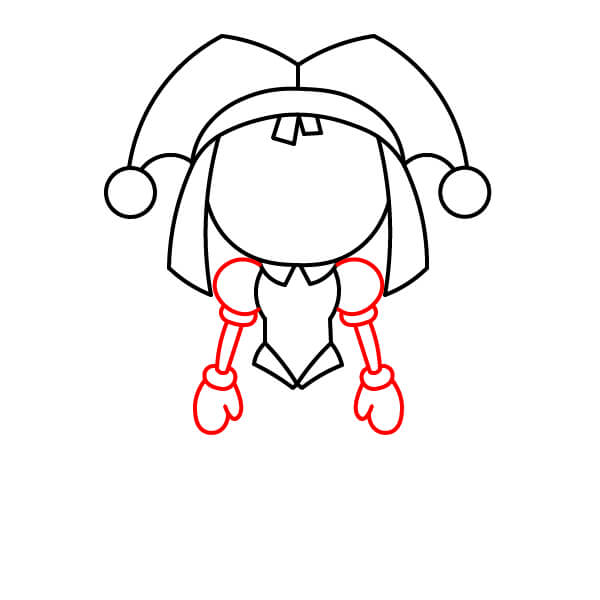 Piirrä kaksi kättä, jotka ojentuvat käsivarsista. Niiden tulisi olla suuret, levittäytyneet ja hanskat kädessä (ranteen ääriviivat osoittavat). Piirrä alaosaan kaksi suurta, pyöreää jalkaa ja lisää viiva jalkojen yläosaan viittaamaan housujen/sukkien pohjiin.