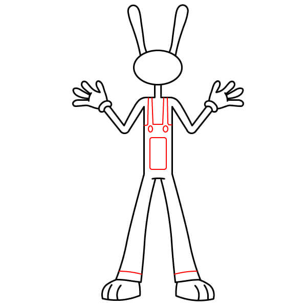 Piirrä Jaxin haalarin yksityiskohdat vartaloon. Lisää kaksi hihnaa, jotka ulottuvat kahdesta yläkulmasta alas ruokalappuun, ja piirrä neliön/suorakaiteen muotoinen tasku ruokalapun keskelle. Lisää pienet ympyrät nappeja varten, joihin hihnat on kiinnitetty.