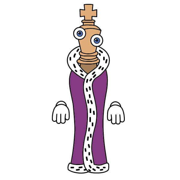 Väritä shakkinappulan pää, risti yläosassa ja kaulus vaaleanruskealla tai ruskealla. Väritä mekon runko tumman violetilla, turkisreunus (katkoviivoilla merkityt alueet) valkoisella ja pisteet mustilla. Väritä hansikkaat kädessä olevat kädet valkoisiksi, silmien valkuaiset valkoisiksi ja pupillit vaaleansinisiksi.