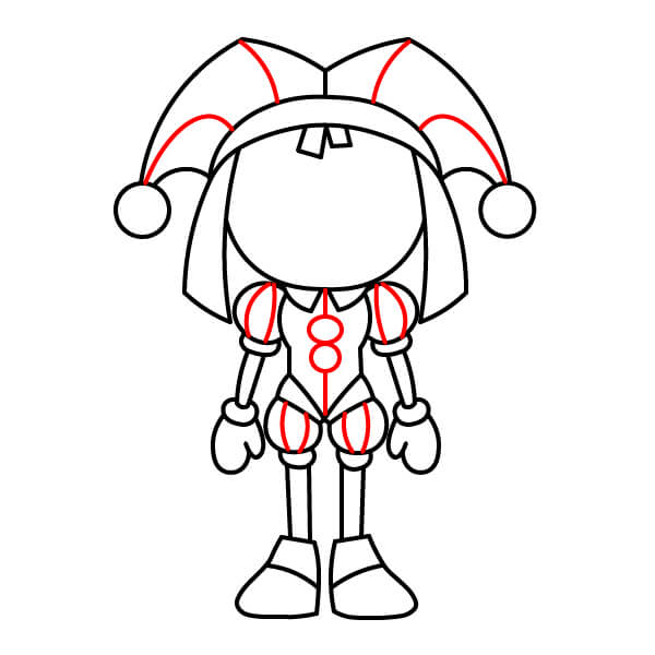 Lisää pieni rusetti kaula-aukkoon ja pystysuorat viivat liiviä varten piirtämiesi viivojen sisäpuolelle, jolloin muodostuu selkeä V-muoto vartalon ympärille. Nämä yksityiskohdat näkyvät punaisella annetussa kuvassa.