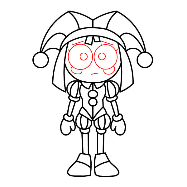 Lisää Pomnin kasvojen viimeiset yksityiskohdat: Piirrä suuret, leveät, surulliset silmät, joissa on pienet pupillit, ja yksinkertainen, irvistävä suu. Lisää kulmakarvat ja ripaus poskipunaa kummankin silmän alle.