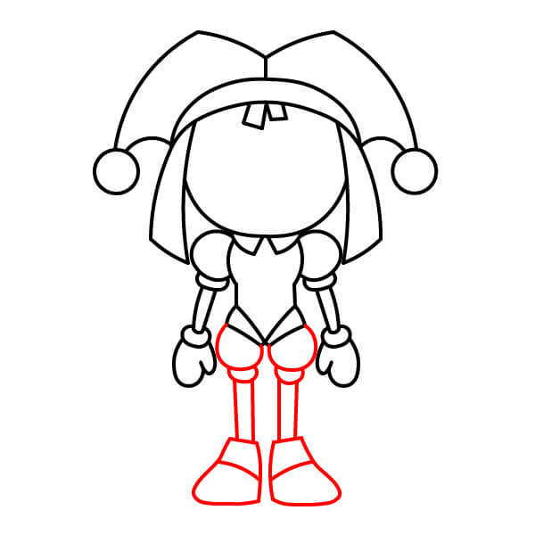 Piirrä kaksi lyhyttä, hoikkaa jalkaa, jotka ulottuvat haalarin alaosasta. Lisää puhvihousut/shortsit juuri polvien yläpuolelle. Täydennä piirtämällä suuret, pyöreät saappaat tai kengät jalkojen päihin.