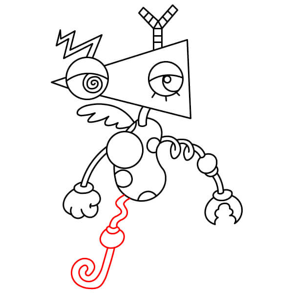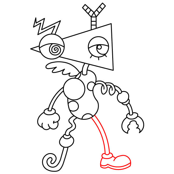 Piirrä vasen jalka (katsojan oikealle puolelle). Tällä jalalla on monimutkaisempi muoto: aaltoileva, nauhamainen muoto, joka ulottuu vartalon alaosasta, on kiinnitetty palloniveleen ja päättyy spiraalijalkaan.