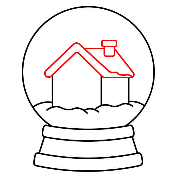Vaihe 8: Piirrä yksinkertainen talo pallon oikealle puolelle, lumikasan taakse. Siinä tulisi olla suorat seinät, kolmionmuotoinen katto, ovi ja yksi ikkuna.