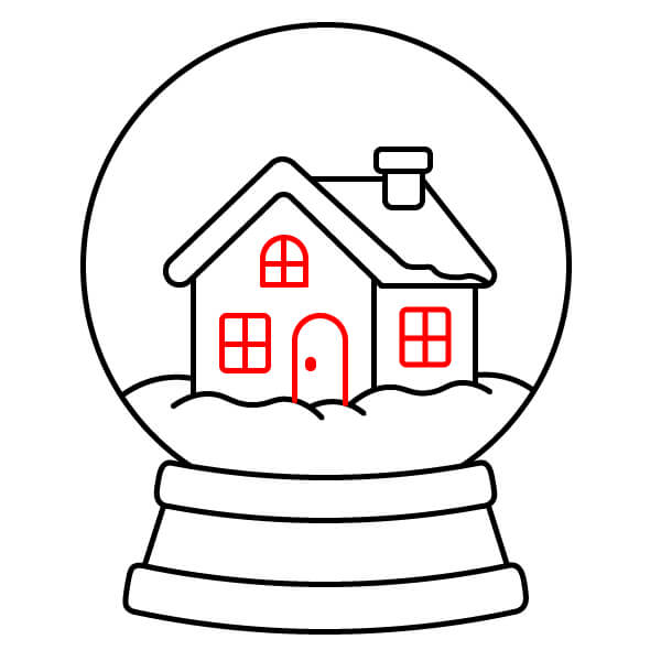 Vaihe 10: Väritä pallon sisäpuoli vaaleansiniseksi, talon pääseinät keltaisiksi tai vaaleanruskeiksi, katto punaiseksi ja savupiippu punaiseksi, jättäen katolla olevan lumen valkoiseksi. Väritä ovi ruskeaksi, ikkunaruudut vaaleankeltaisiksi tai valkoisiksi, lumikasa valkoiseksi, pohja juhlavaksi väriksi, kuten vihreäksi, ja listat/reunat kontrastiväriksi, kuten tummemman vihreäksi tai mustaksi.