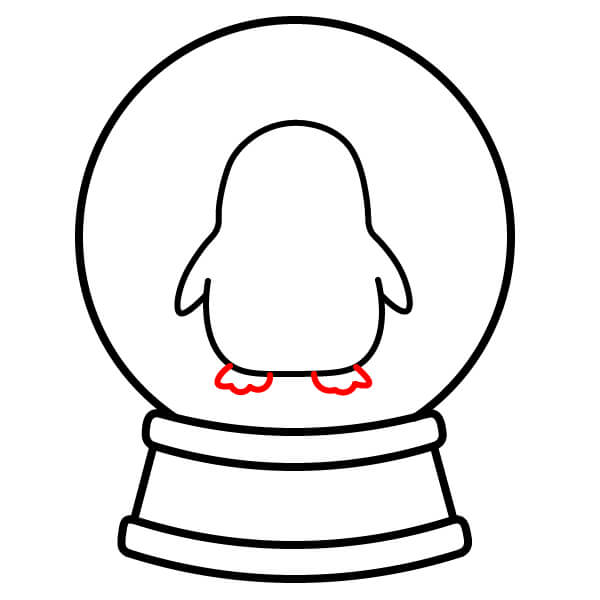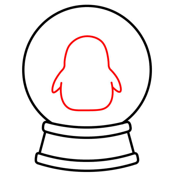 Vaihe 8: Piirrä aaltoviiva pallon pohjaan, juuri pingviinin jalkojen alapuolelle, kuvaamaan lumikuoppaa. Piirrä useita pieniä ympyröitä pallon sisällä olevaan tyhjään tilaan kuvaamaan putoavia lumihiutaleita.