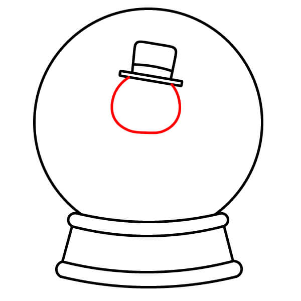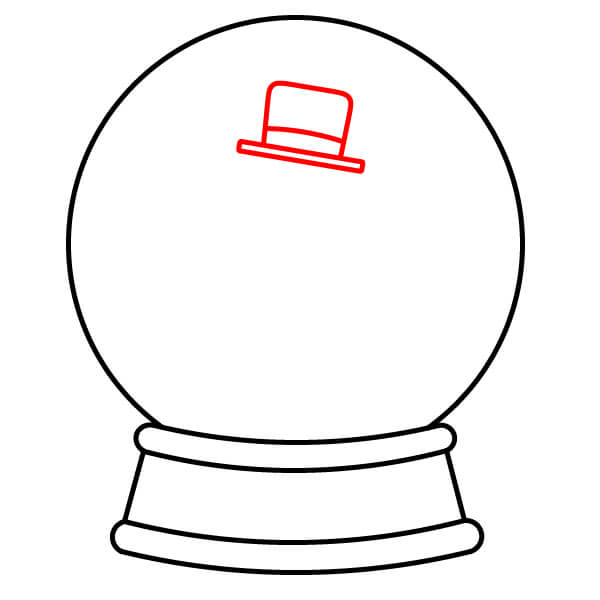 Vaihe 4: Piirrä pallon sisäpuolelle, lähelle yläreunan keskustaa, hieman kallistettu suorakulmio, jonka päälle tulee pienempi, kapeampi suorakulmio. Lisää alemman suorakulmion alle kaareva viiva lumiukon silinterin hatun lieriä varten.