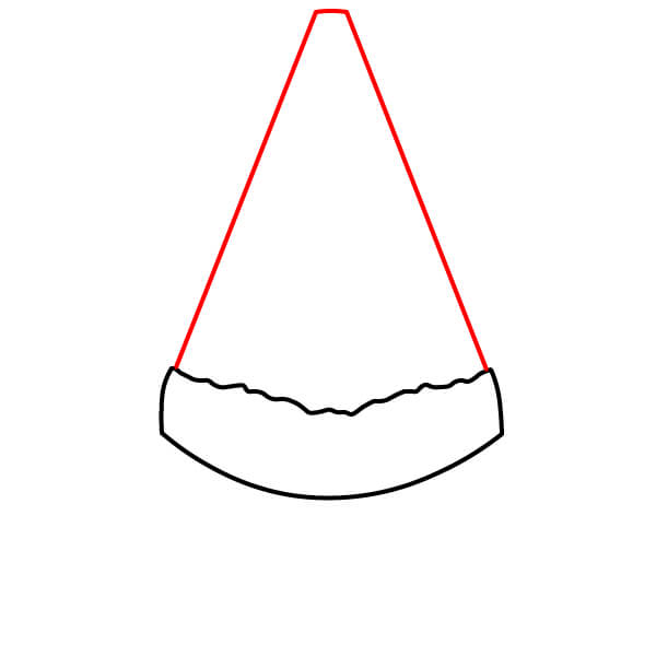 Lisää nyt vesimeloniviipaleen yläosa, joka on kolmion muotoinen. Piirrä kaksi suoraa viivaa ylöspäin ja sisäänpäin Vaiheessa 1 piirtämäsi aaltoilevan reunan päistä, niin että viivat kohtaavat yhdessä pisteessä ylhäällä.