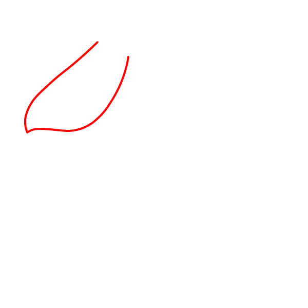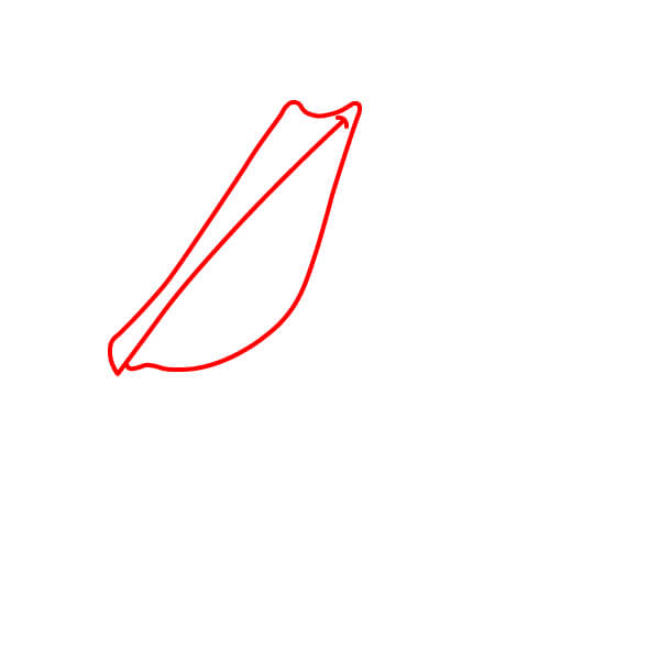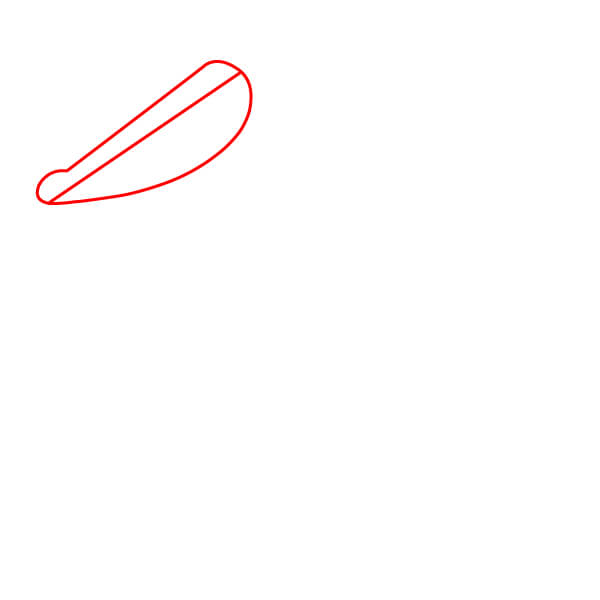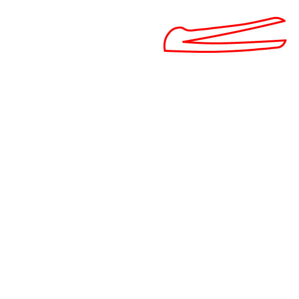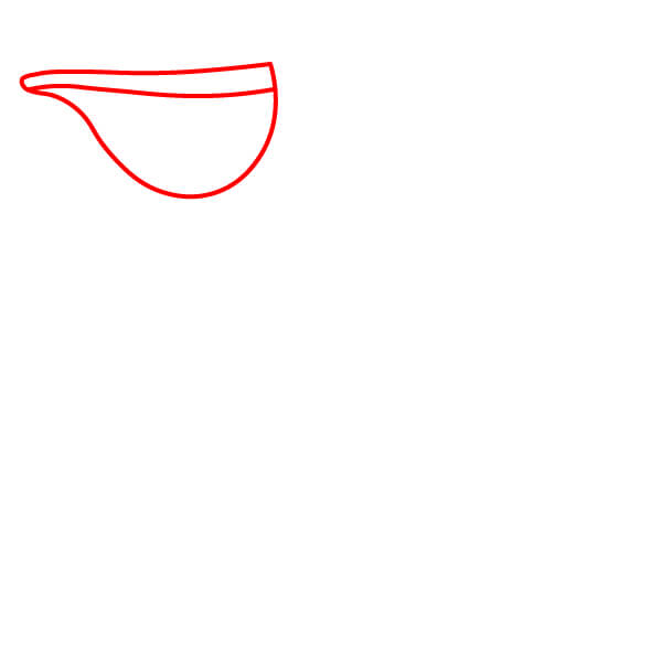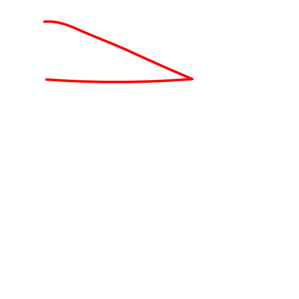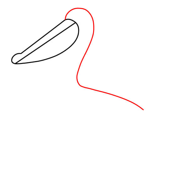 Aloita piirtämällä kaksi pitkää, hieman kaarevaa rinnakkaista viivaa, jotka kohtaavat kärjessä ja muodostavat pelikaanin nokan ylä- ja alaosan. Lisää taakse pieni, pyöristetty kaari nokan niveleksi.