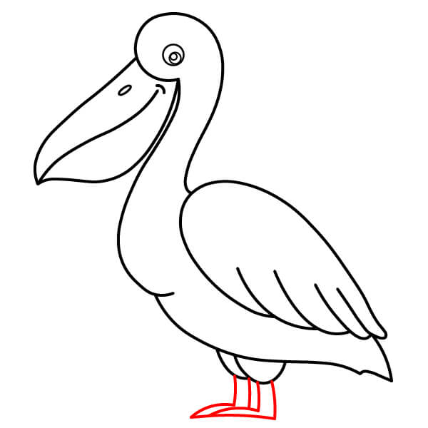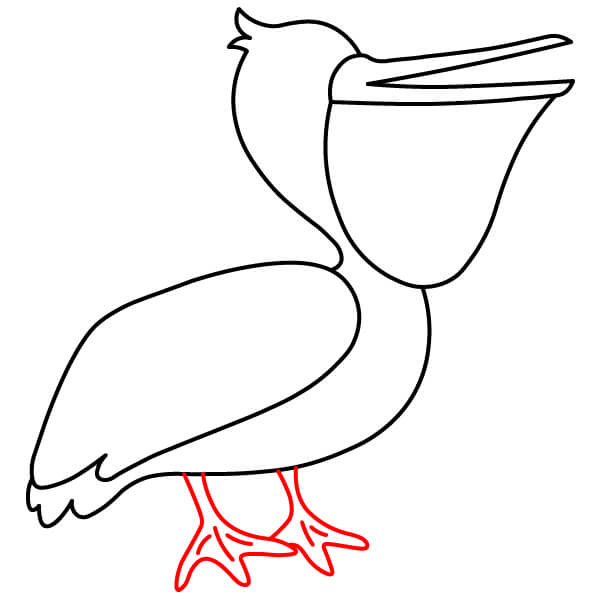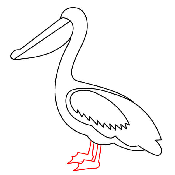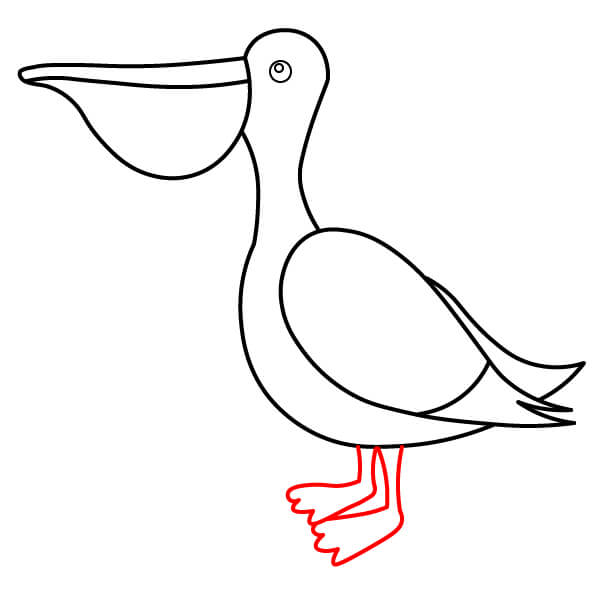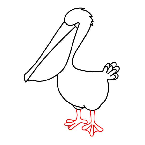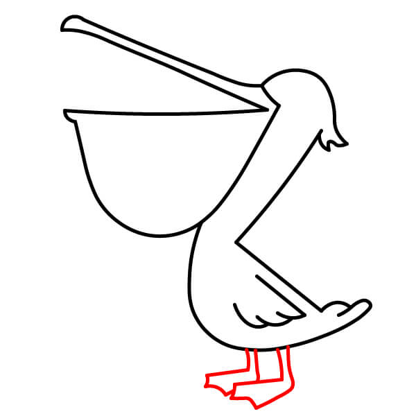 Piirrä vaiheessa 7 piirretyistä käyristä räpyläjalkojen ääriviivat. Koska pelikaani on lepoasennossa, jalat ovat lyhyet ja käpälät piirretään yksinkertaisiksi, litteiksi, räpylämäisiksi muodoiksi.
