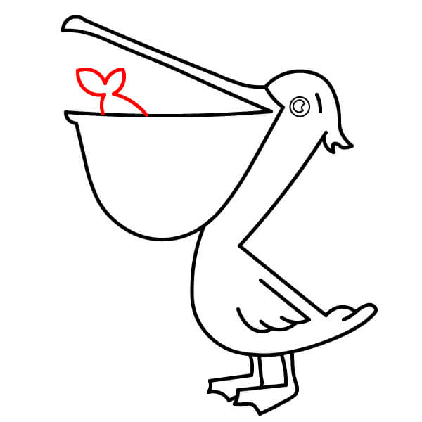 Piirrä avoimen pussin sisään pieni, yksinkertainen kalan muoto. Se voi olla yksinkertainen soikea, jossa on pyrstöevä, mikä viittaa siihen, että pelikaani on juuri saanut ruokansa.