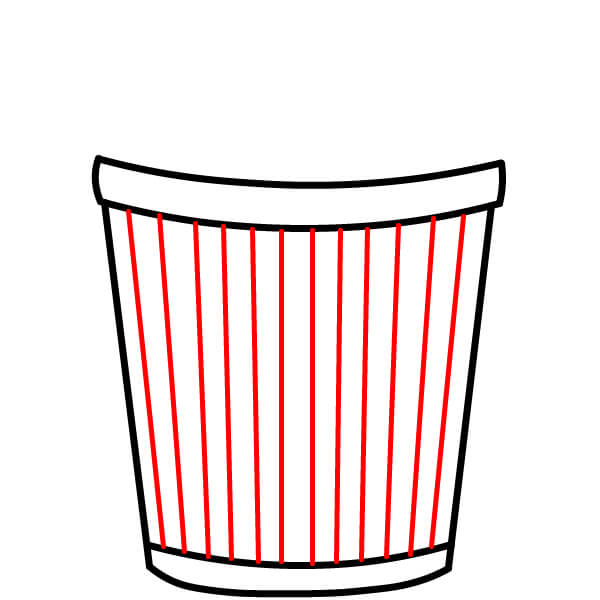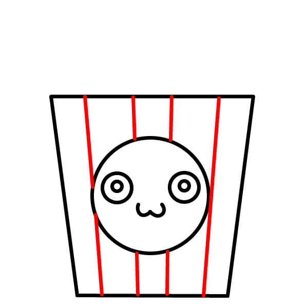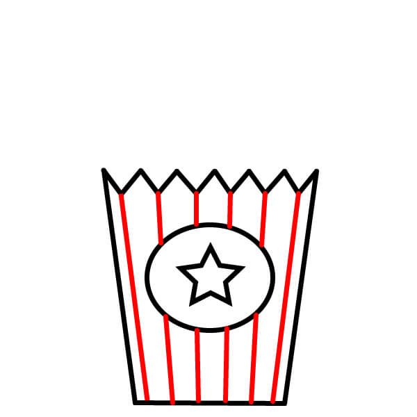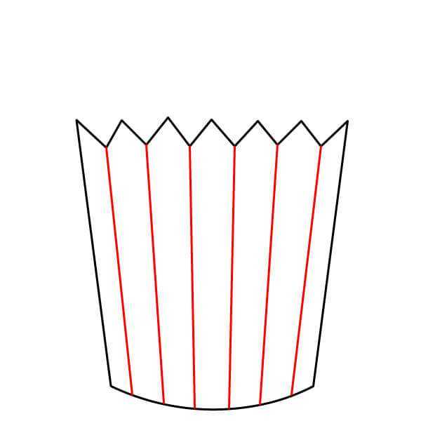 Piirrä pystysuoria viivoja ämpäriin siksak-muotoisesta yläreunasta alareunaan asti. Varmista, että viivat kulkevat keskellä olevan soikion takaa. Nämä muodostavat popcorn-ämpärin klassiset raidat.