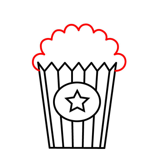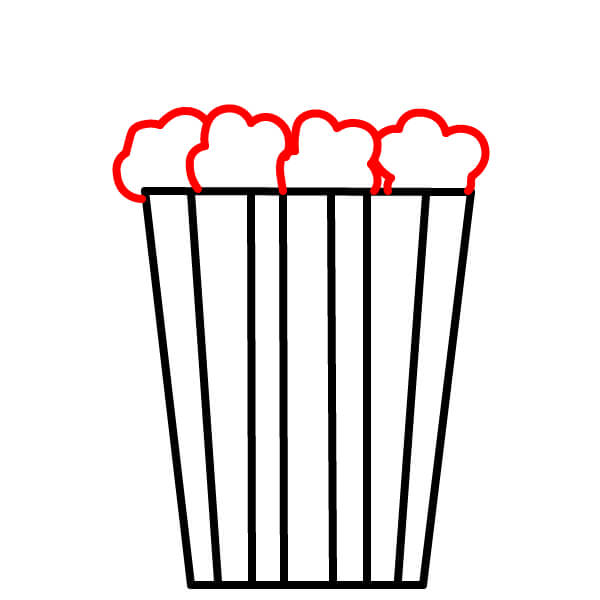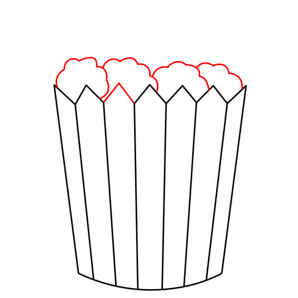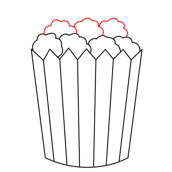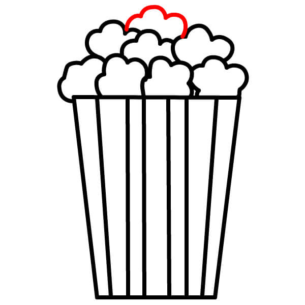 Piirrä siksak-muotoisen yläreunan yläpuolelle suuri, epäsäännöllinen, pilvimäinen muoto. Tämä on pääkasa popcornia, joka pursuaa ämpäristä.