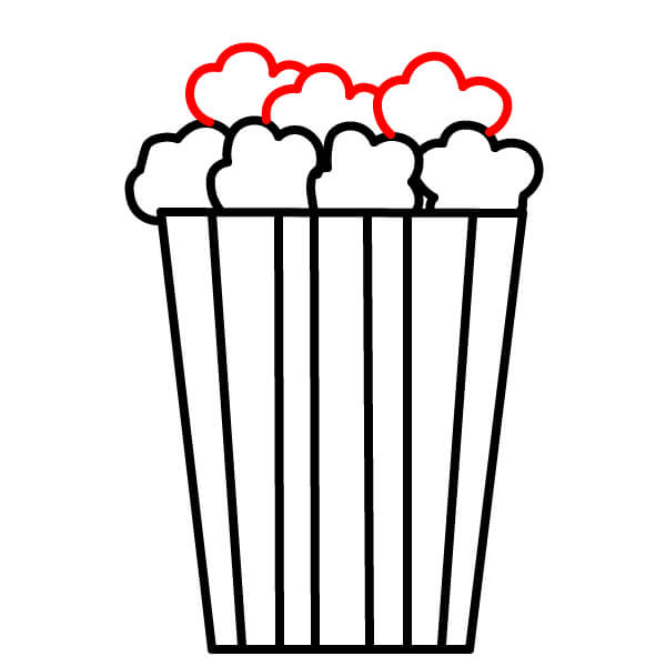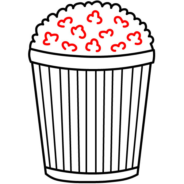 Piirrä ämpärin päälle useita pörröisiä, pilvimäisiä muotoja vierekkäin. Ne esittävät popcornia, joka pursuaa astiasta.