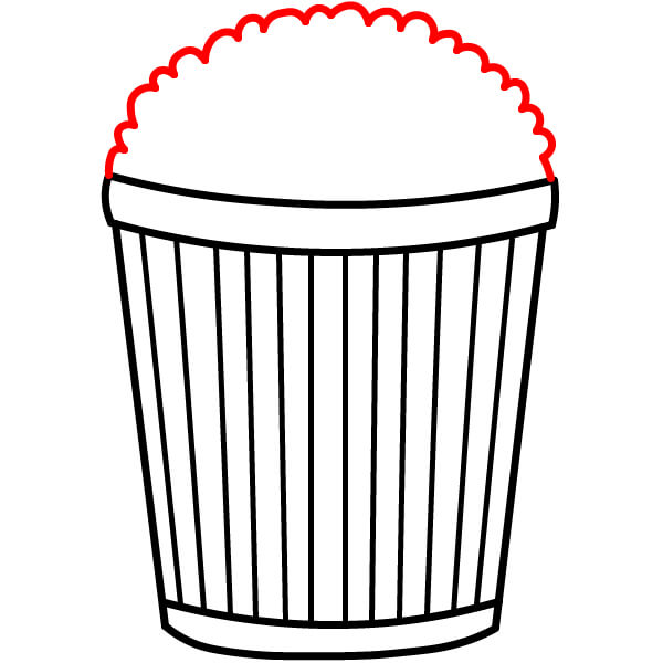 Piirrä suuri, epäsäännöllinen, pilvimäinen muoto ämpärin kampareunaisen yläreunan päälle. Tämä kuvaa päällimmäistä popcorn-kasaa.
