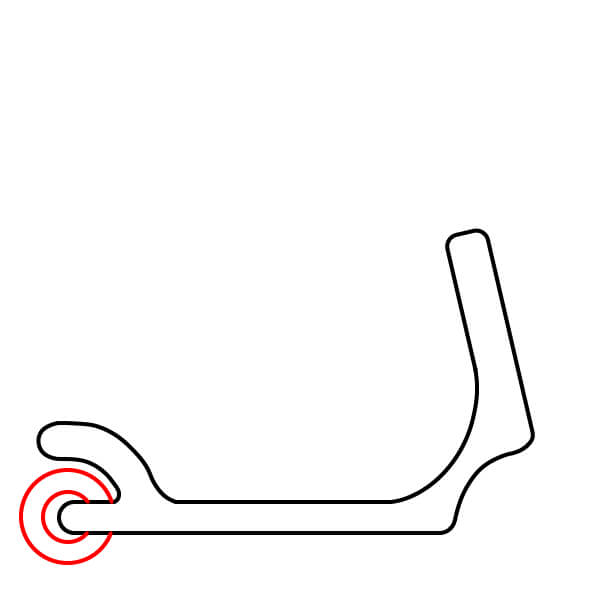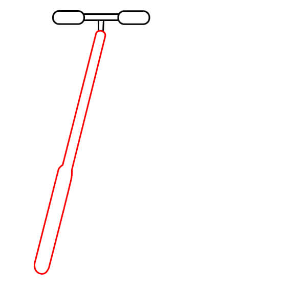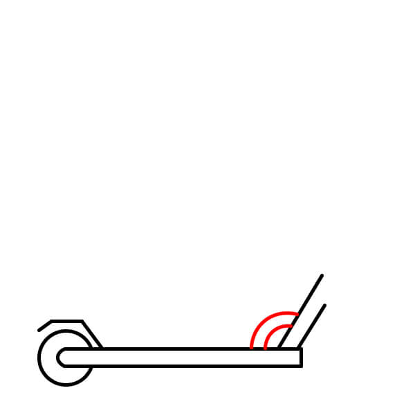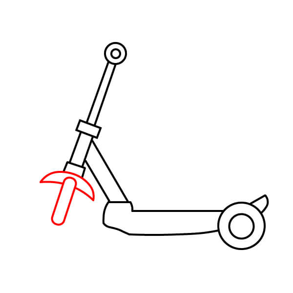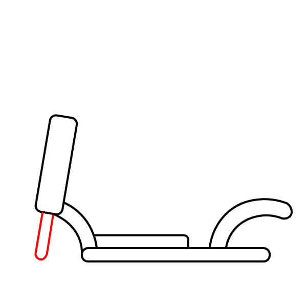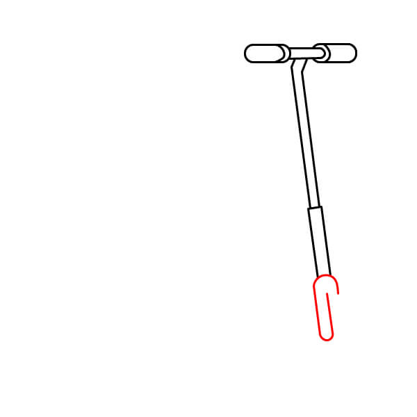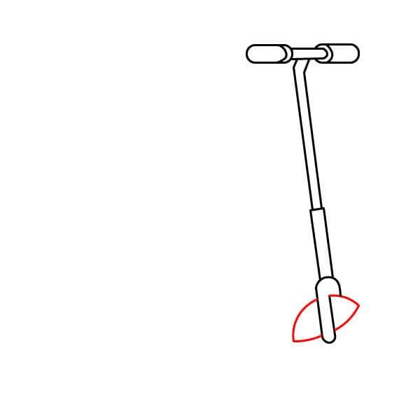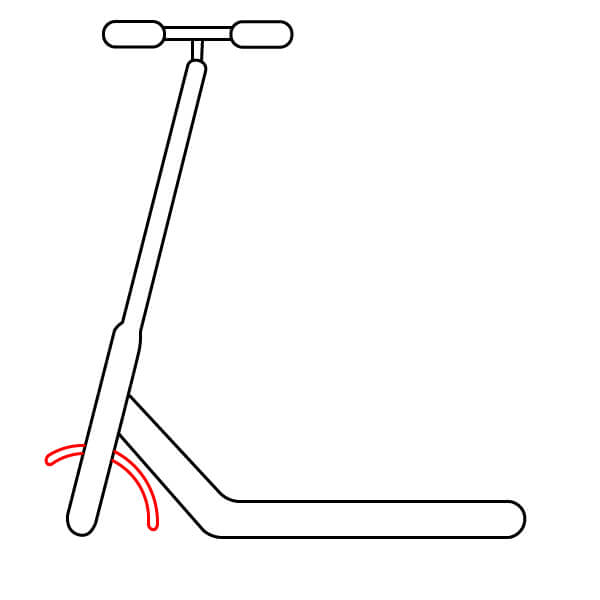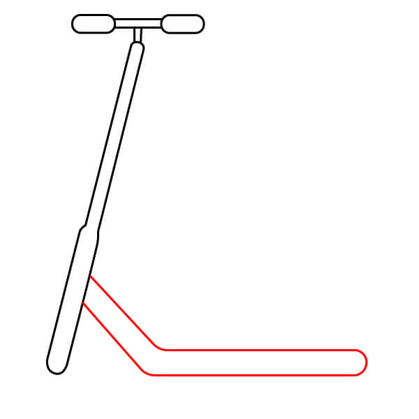 Vaihe 2: Piirrä yksi pitkä, kaareva viiva, joka alkaa juuri ohjaustangon liitoksen alapuolelta ja jatkuu alaspäin ja hieman oikealle, päättyen litistettyyn, pyöristettyyn suorakulmioon. Tämä muodostaa skootterin rungon.