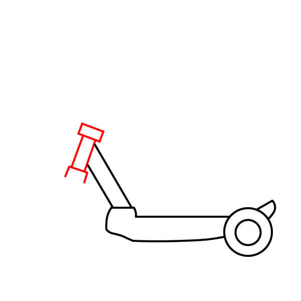 Vaihe 4: Lisää etupyörän tuki. Piirrä pääohjauspylvään vasemmalle puolelle kaksi lyhyttä, kaarevaa viivaa, jotka näyttävät sulkuilta ja ulottuvat alaspäin ja hieman ulospäin.