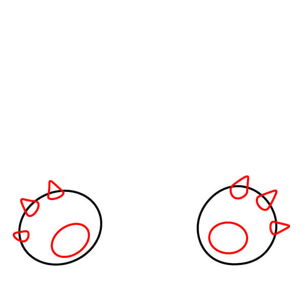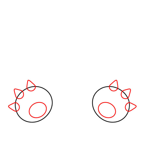 Piirrä kummankin ympyrän sisäpuolelle pienempi ympyrä jalkapohjaa varten. Lisää kolme kolmionmuotoista muotoa (punainen) kunkin suuren ympyrän kehään kynsien muodostamiseksi.