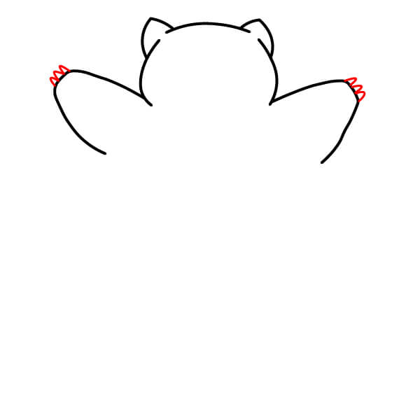 Piirrä kaksi ylöspäin kaartuvaa viivaa, jotka ulottuvat pään kummaltakin puolelta. Nämä muodostavat Snorlaxin käsivarsien perusmuodon, jotka ovat leveästi ojennettuina.