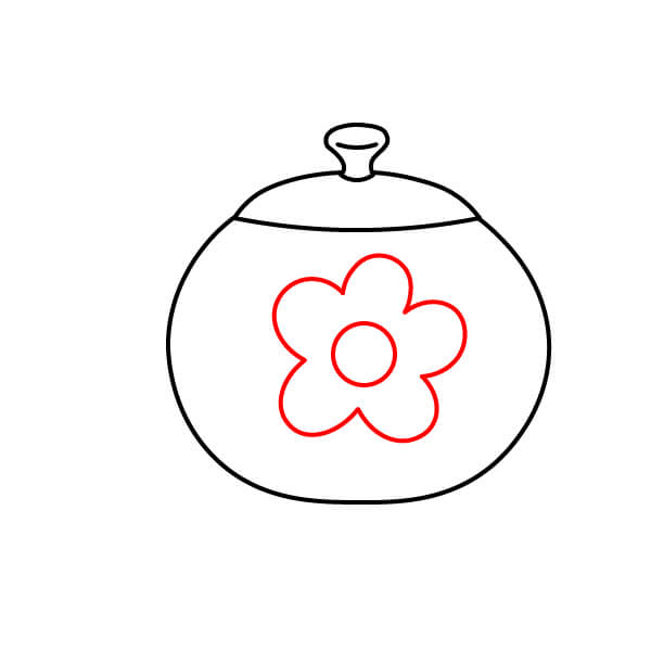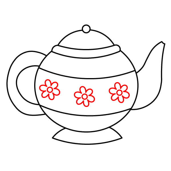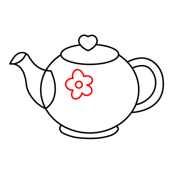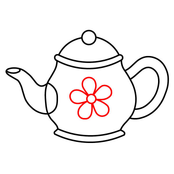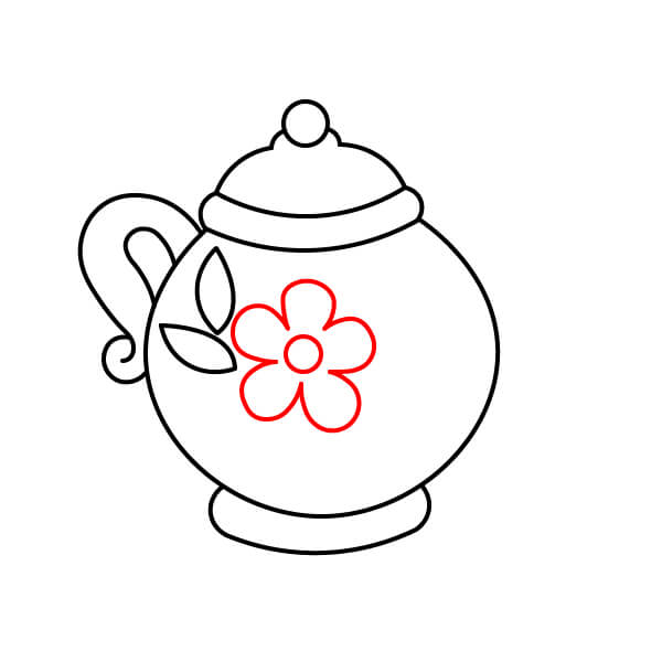 Piirrä teekannun rungon etupuolelle viisiterälehtinen kukka, jonka keskellä on ympyrä. Tämä lisää koristeellista ilmettä.
