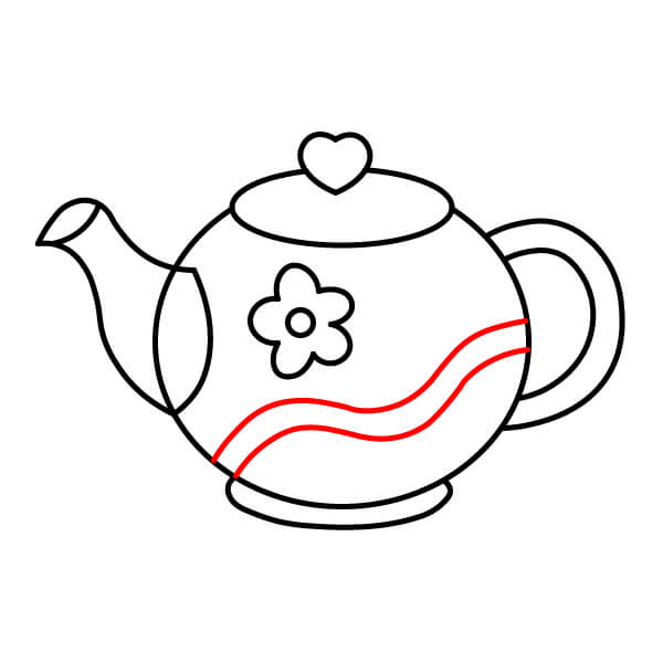 Piirrä teekannun alaosaan aaltoileva raita, kaksi viivaa ulottuen nokasta kahvaan.