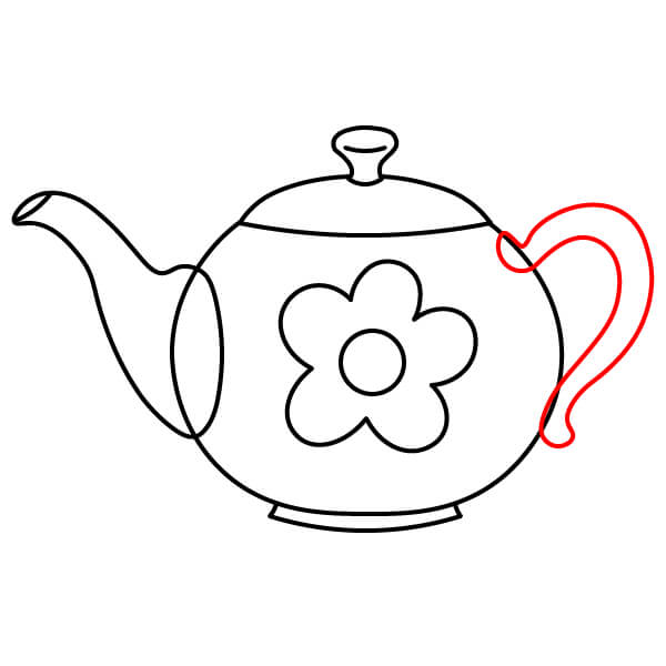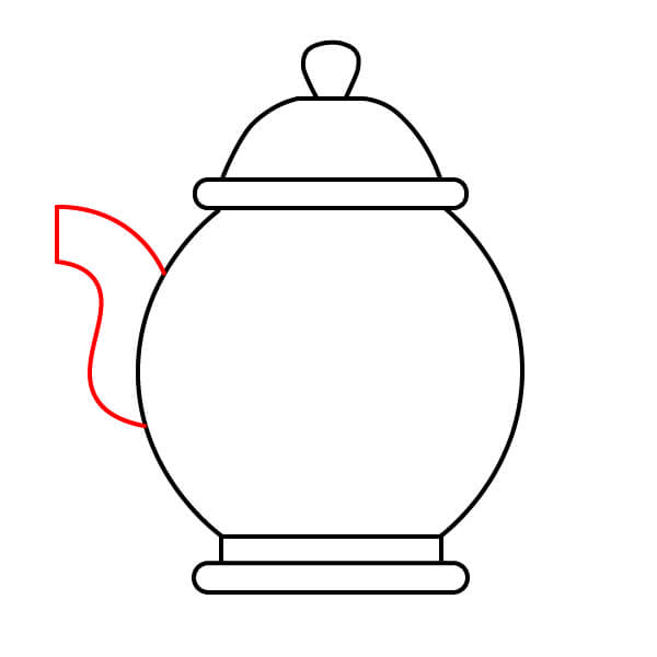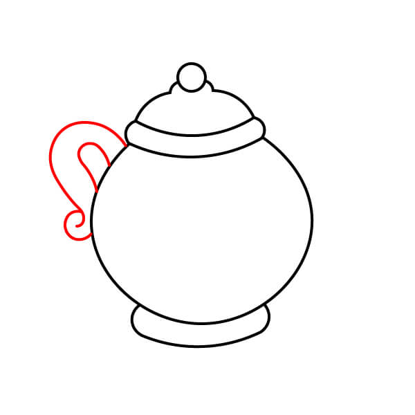 Piirrä teekannun rungon vasemmalle puolelle kahva. Tässä kahvassa on tyylikäs C-kirjaimen muoto ja pieni koristeellinen kierre pohjassa.