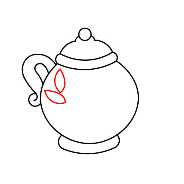 Piirrä teekannun rungon sivulle, lähelle kahvaa, kaksi pientä, kaarevaa lehden muotoa.
