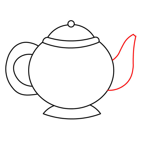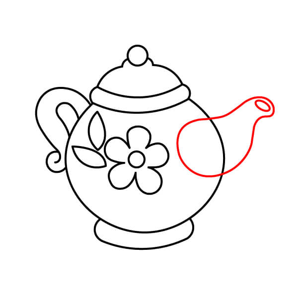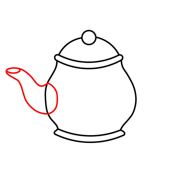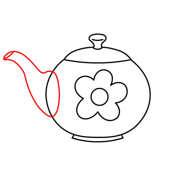 Piirrä teekannun rungon vasemmalle puolelle kaatonokka. Tämä on kaareva kaatonokka, hieman S-muotoinen ja kapenee päätä kohti.