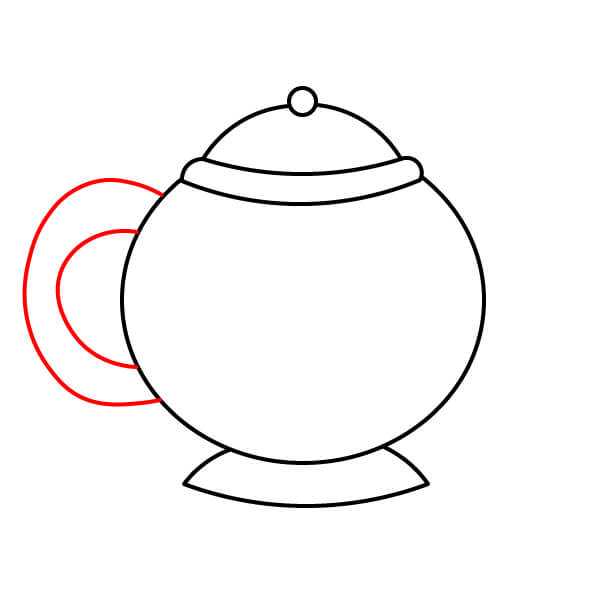 Piirrä teekannun rungon vasemmalle puolelle kahva. Sen tulisi olla C-kirjaimen muotoinen, jonka muodostavat kaksi samankeskistä käyrää.