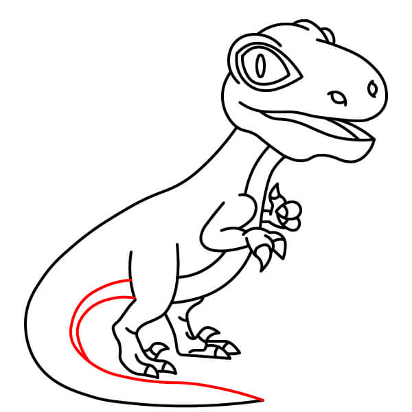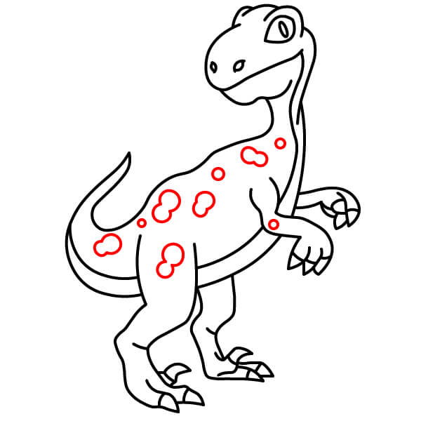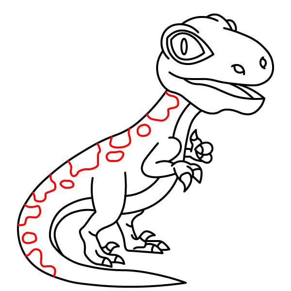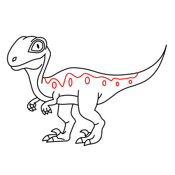 Nyt voit värittää Velociraptorisi! Käytä päävartaloon vaaleansinistä. Väritä juuri piirtämäsi kuviot kirkkaan oranssilla. Vatsan tulisi olla vaaleanruskea tai kermanvärinen. Käytä keltaista silmiin, joissa on mustat pupillit, ja vaaleanharmaata kynsiin ja suun sisäpuolelle.
