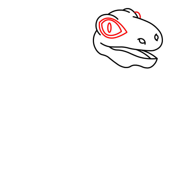 Lisää yksityiskohtia kasvoihin. Piirrä pään sisäpuolelle suuri ympyrä silmää varten ja sen sisäpuolelle pienempi ympyrä pupillia varten. Lisää pieni viiva sierainta varten ja muutama lyhyt kolmio suun sisäpuolelle hampaita varten sekä käyrä kieltä varten.