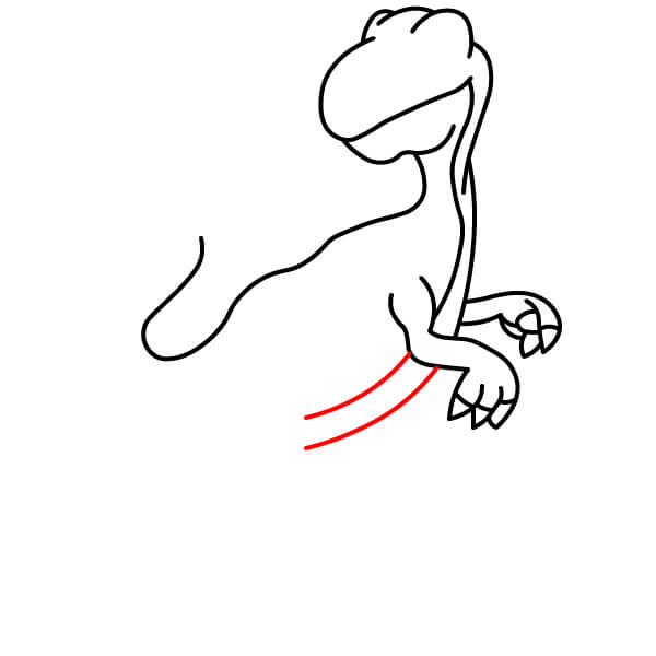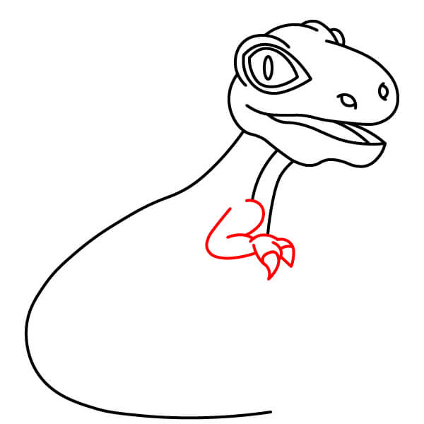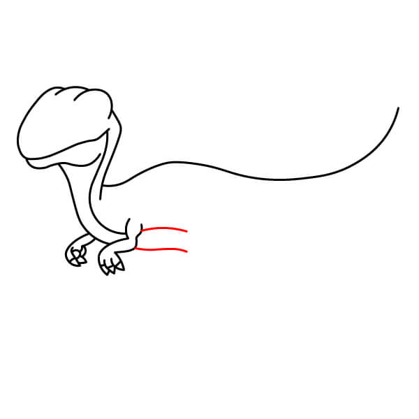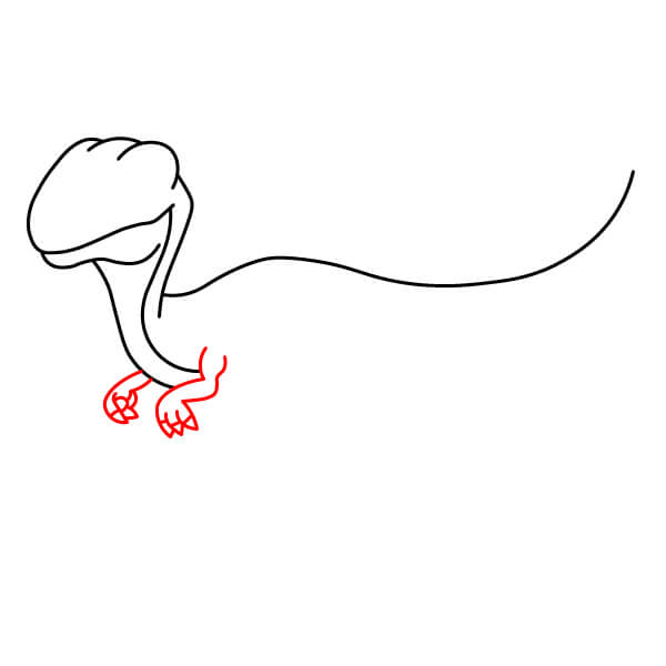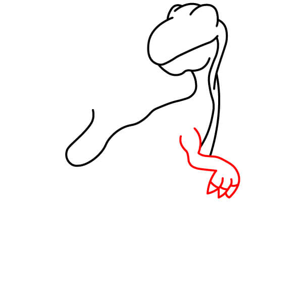 Piirrä nyt pitkä käyrä dinosauruksen ensimmäistä jalkaa ja käpälän muotoa varten. Lisää kaksi terävää kynttä loppuun.