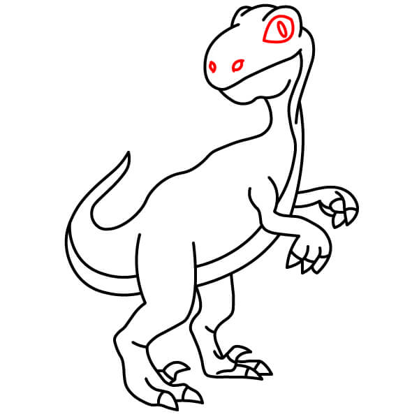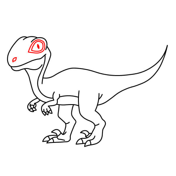 Väritä velociraptorin päärunko vaaleansinisellä tai turkoosilla. Käytä hieman tummempaa vaaleansinistä tai turkoosia sävyä selän ja sivujen aaltoileviin viivoihin ja ympyröihin korostaaksesi niitä. Väritä sekä etu- että takajalkojen kynnet vaaleanharmaalla tai vaaleanvalkoisella. Oikean silmän suurempi ulkoosa on kirkkaan keltainen, kun taas pienempi sisempi pupilli voi olla musta.