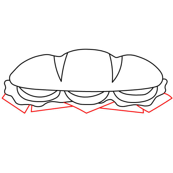 Vaihe 2: Piirrä aaltoviiva, joka ulottuu päällimmäisen leivän alta. Tämä on ensimmäinen täytekerros, todennäköisesti salaattia.